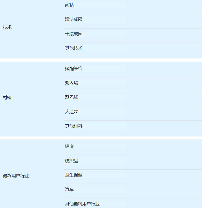 无纺布被广义地定义为通过机械,热或化学缠绕纤维或长丝粘合在一起的片状或网状结构。它们是直接由单独的纤维或熔融塑料或塑料薄膜制成的扁平多孔片材。无纺布市场按技术,材料,最终用户行业和地区进行细分。按技术,市场分为纺粘、湿法成网、干法成网和其他技术。按材料,市场分为聚酯,聚丙烯,聚乙烯,人造丝和其他材料。按最终用户行业划分,市场分为建筑、纺织、医疗保健、汽车和其他最终用户行业。
